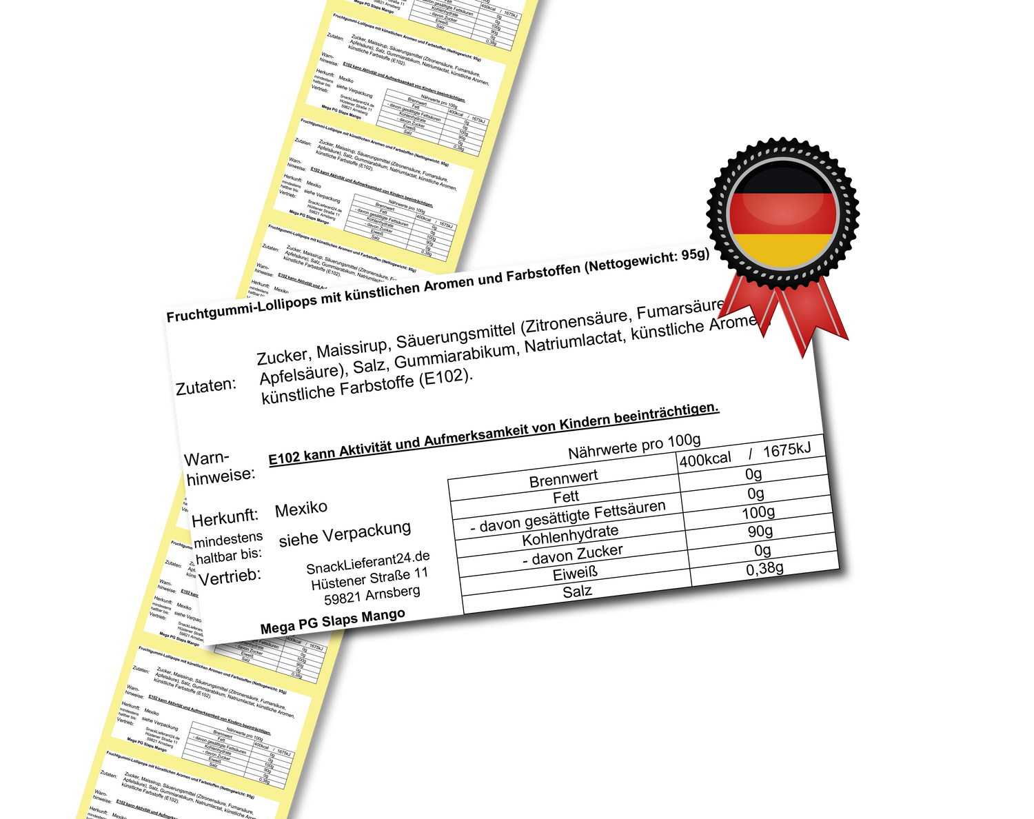 Als euer Großhändler und Importeur stellen wir für alle Produkte ohne deutsche Deklaration kostenlose Etiketten mit deutschen Nährwertangaben zur Verfügung. Unsere Etiketten enthalten alle wesentlichen Informationen, sodass ihr euch ganz auf den Vertrieb konzentrieren könnt. Kundenservice und Unterstützung stehen bei uns an erster Stelle.